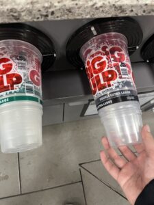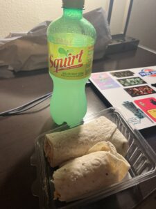 でかい!スムージーのディスペンサーが置いておあり、自分でカップを選び購入するスタイル。一番でかいやつが写真のもので、まさにアメリカンサイズ。2枚目はラップサンドとsquirtというソーダ、夜食にぴったり(本当は朝食にするつもりだったが寝られずに夜食とした)