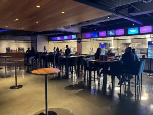 中央のディスプレイの巨大さ。内側にもティスプレイがあり、全方位からスタッツやリプレイを確認できる。ちなみに後日向かったIntuit Domeはもっとすごい。